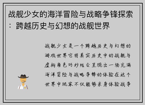 战舰少女的海洋冒险与战略争锋探索:跨越历史与幻想的战舰世界