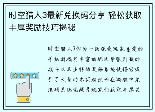 时空猎人3最新兑换码分享 轻松获取丰厚奖励技巧揭秘