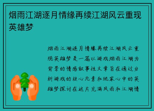 烟雨江湖逐月情缘再续江湖风云重现英雄梦